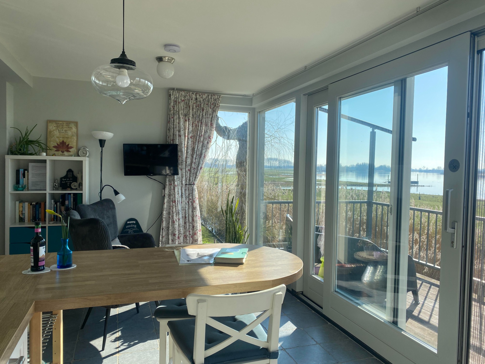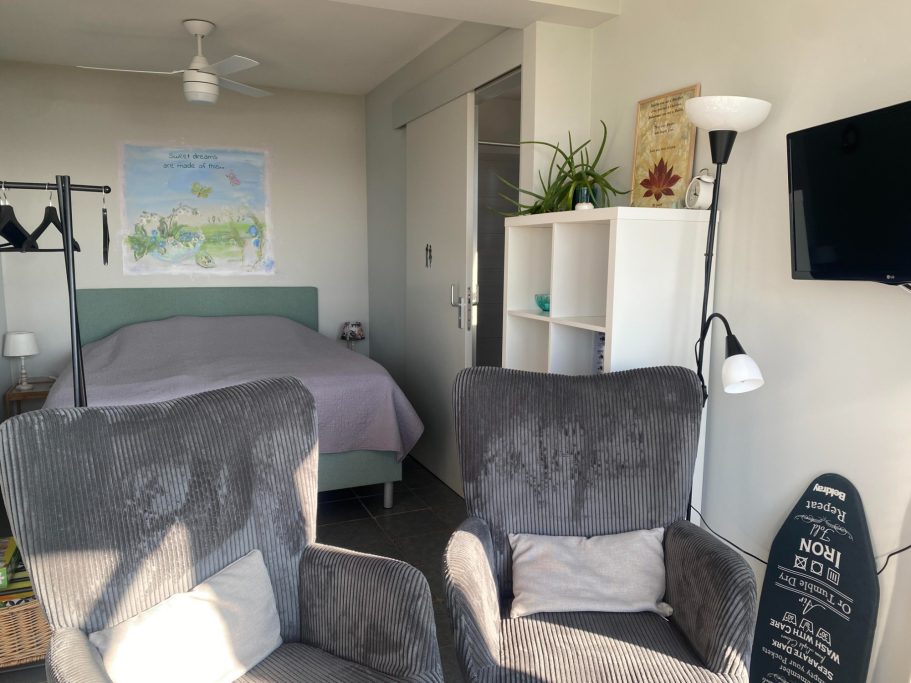 Het zit- en slaapgedeelte is voorzien van een boxspring van waaruit u hetzij naar de televisie dan wel naar buiten kunt kijken. Er zijn 2 comfortabele stoelen.