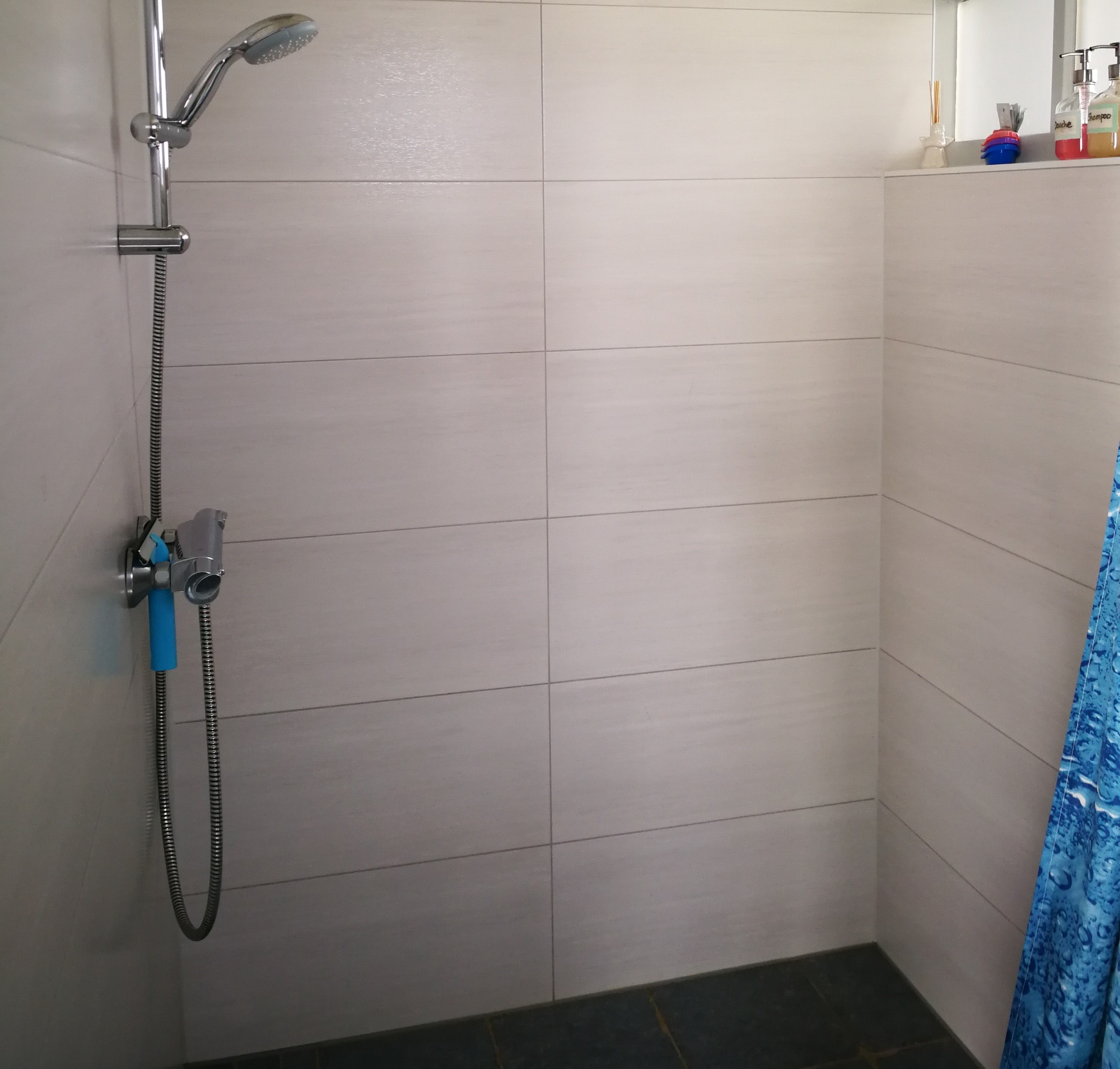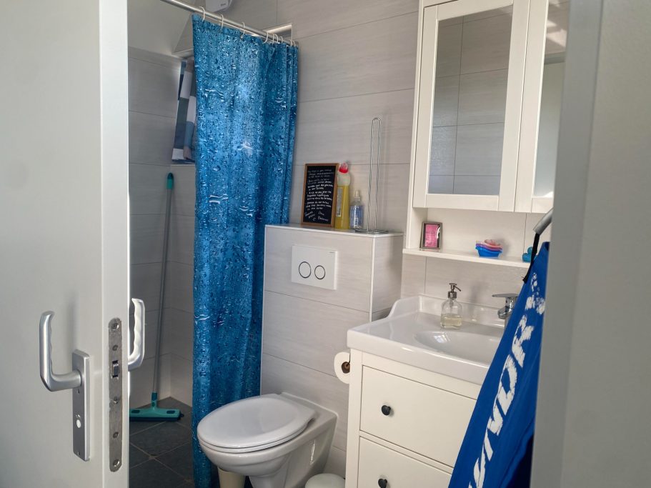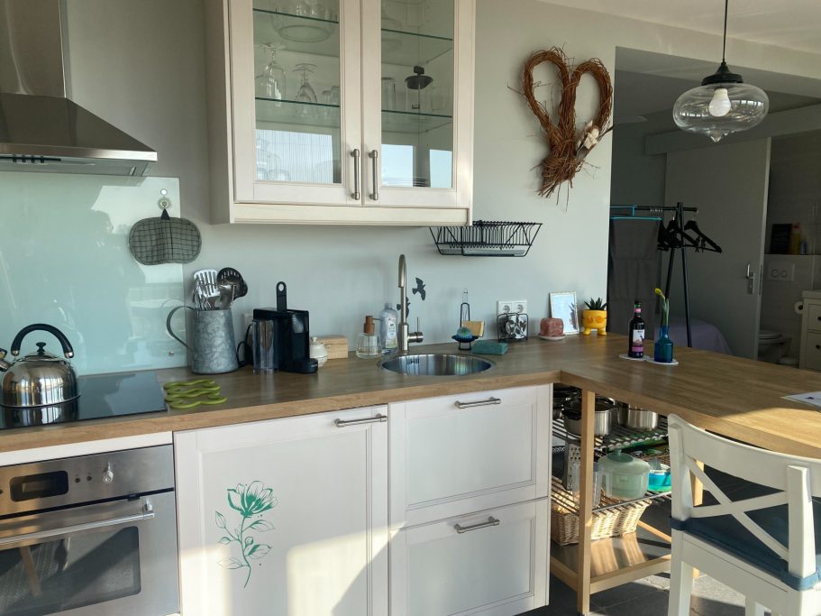 Er is een compacte keuken met eetbar en 2 barkrukken. De keuken is voorzien van combimagnetron, kookplaat, koelkast en koffiezetter (nespresso cups). De douche, het toilet en het badkamermeubel bevinden zich in een aparte ruimte, afgesloten door een schuifdeur.